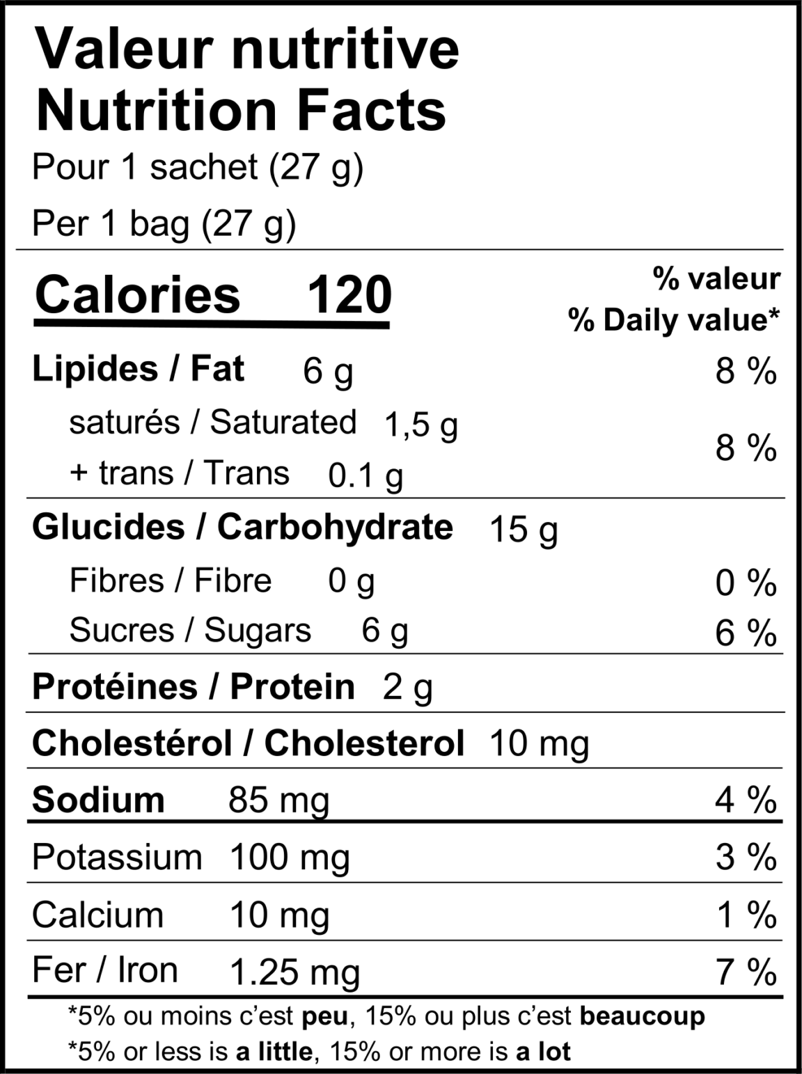 Wheat flour, Margarine (canola oil, modified palm and modified palm kernel oils (soy)), Sugars (sugar, icing sugar), Liquid whole eggs, Cocoa powder, Buttermilk powder, Modified corn starch, Salt. Contains: Milk, Eggs, Wheat, Soy. May contain: Oat.