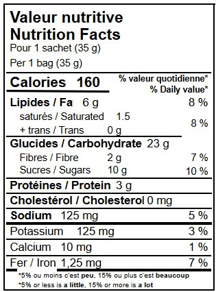 Granola (rolled oats, sugars (brown sugar), whole wheat flour, margarine (canola oil, modified palm and modified palm kernel oils (soy)), water, chocolate chip (sugar (sugar, dextrose), unsweetened chocolate, cocoa butter, soy lecithin, vanilla extract), cocoa powder, puffed quinoa, salt, natural flavour), Puffed cereal (quinoa flour, rice flour, oat flour, cane sugar, corn starch, pea protein, iron bisglycinate). Contains: Soy, Wheat, Oat. May contain: Eggs, Milk.
