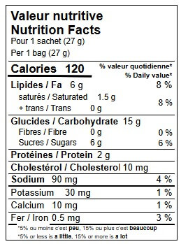 Ingredients: Wheat flour, Margarine (canola oil, modified palm and modified palm kernel oils (soy)), Sugars (sugar, icing sugar), Liquid whole eggs, Buttermilk powder, Modified corn starch, Salt, Natural flavour. Contains: Eggs, Milk, Wheat, Soy. May contain: Oat.