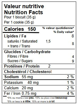 Ingrédients : Flocons d’avoine, Farine de blé, Margarine (huile de canola, huile de palme et de palmiste modifiées (soya)), Sucres (sucre, cassonade, sucre inverti), Garniture aux dattes (dattes, eau, benzoate de sodium,acide citrique), Eau, Bicarbonate de sodium, Propionate de calcium, Sel, Gomme de xanthane, Gomme de guar. Contient: Soya, Blé, Avoine. Peut contenir: Œufs, Lait.
