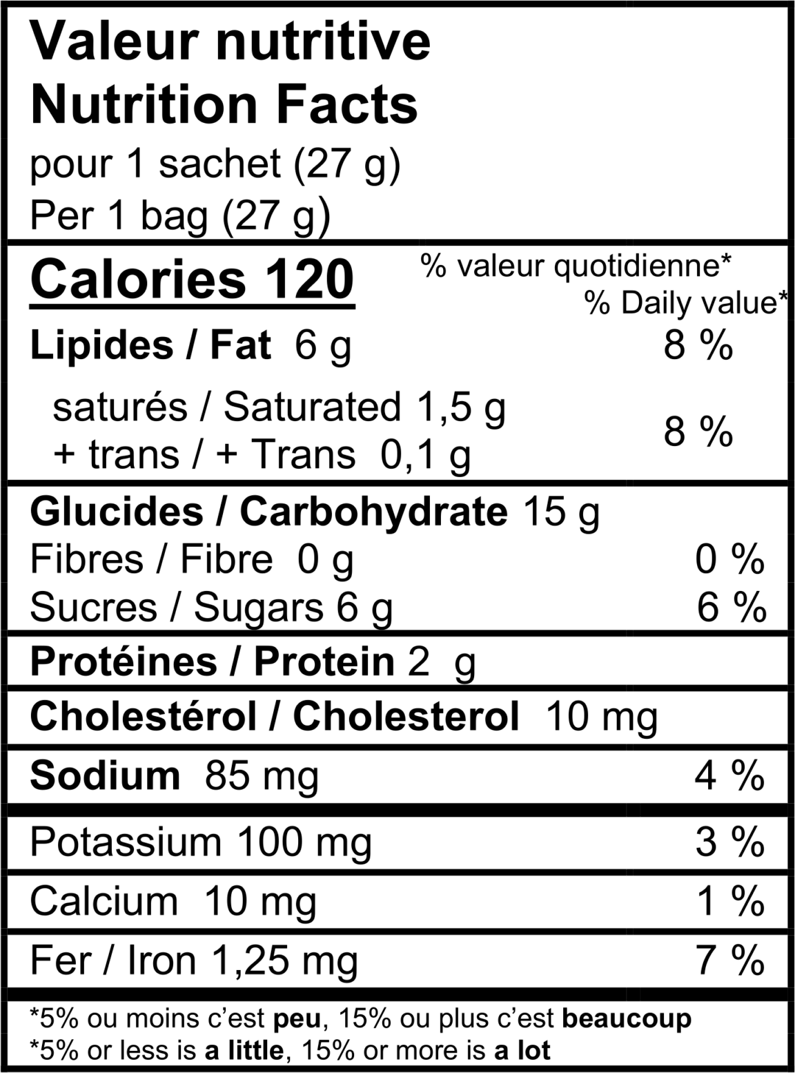 Farine de blé, Margarine (huile de canola, huile de palme et de palmiste modifiées (soya)), Sucres (sucre, sucre à glacer), Œufs entiers liquides, Poudre de cacao, Poudre de babeurre, Amidon de maïs modifié, Sel. Contient: Lait, Œufs, Blé, Soya. Peut contenir: Avoine.